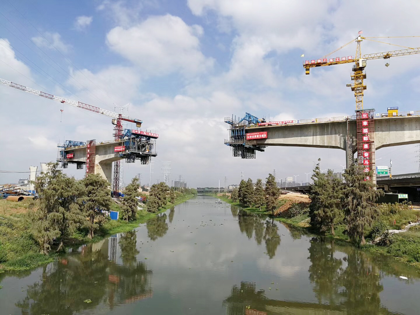 作為備受武漢百姓關注的工程,該標段面臨著管線改遷難度大、地質條件差、掛籃難度高的難題。針對管線遷難題,項目部通過組織對管線進行詳細調查,制定了管線遷改方案,協(xié)助業(yè)主推動管線遷改,還針對110kv和220kv架空高壓走廊交叉和并行施工的情況,制定了高壓走廊安全防護方案,組織專業(yè)人員進行防護設施安裝,安排專人值守進行重點防控,有效推進管線改遷。由于該地區(qū)是巖溶地質,項目部采用“一樁一鉆”辦法實現(xiàn)樁位勘察全覆蓋,編制了巖溶專項施工方案,組織有區(qū)域內巖溶處理經驗豐富的協(xié)作隊伍進行施工,并在過程中加強監(jiān)測,有效化解熔巖地質施工難題。針對小半徑曲線掛籃施工,項目部通過建立三維模型進行理論計算分析,采用“應力—應變”雙向控制的方法進行全過程管控,并安排專業(yè)監(jiān)控量測隊伍對懸臂掛籃法連續(xù)梁進行監(jiān)測,成功攻克了曲線掛籃施工難題。