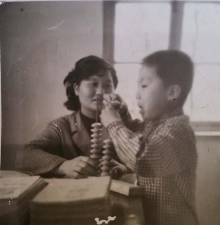 在這張泛黃的老舊照片上,老師孫毅眼神充滿關(guān)懷,手把手地教導(dǎo)著一年級的孔慶偉擺弄教具上的珠子。小朋友神情專注,微微張開的嘴巴似乎急切著想解開教具上謎題。